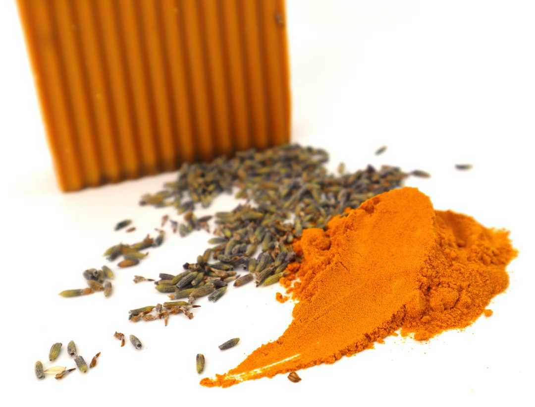 Coconut Oil, Palm Oil, Safflower Oil, Glycerine, Cocoa Butter, Purified Water, Curcuma longa (Turmeric), Lavendula Angustifolia (Lavender), Citrus Limonum (Lemon), Melaleuca Alternifolia (Tea Tree), Sodium Hydroxide, Sorbitol (moisturizer), Sorbitan oleate (emulsifier), Propylene Glycol (made from vegetable glycerine), Oat protein (conditioner), and Titanium Dioxide.