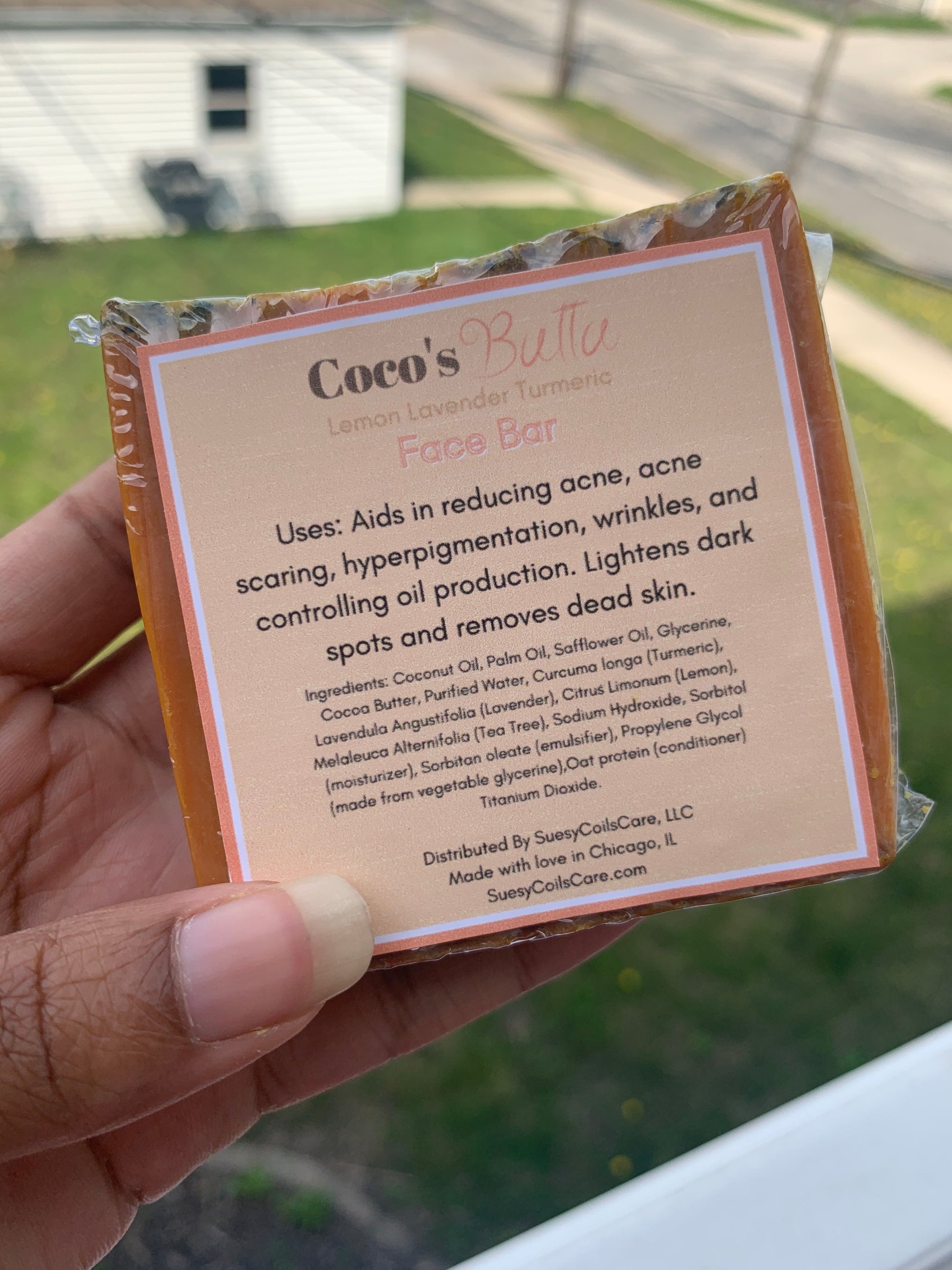 Coco's Butta Lemon Lavender Turmeric Face Bar aids in reducing acne, acne scarring, hyperpigmentation, wrinkles, and controlling oil production. Lightens dark spots and removes dead skin. Great for all skin types. Recommended for daily use.