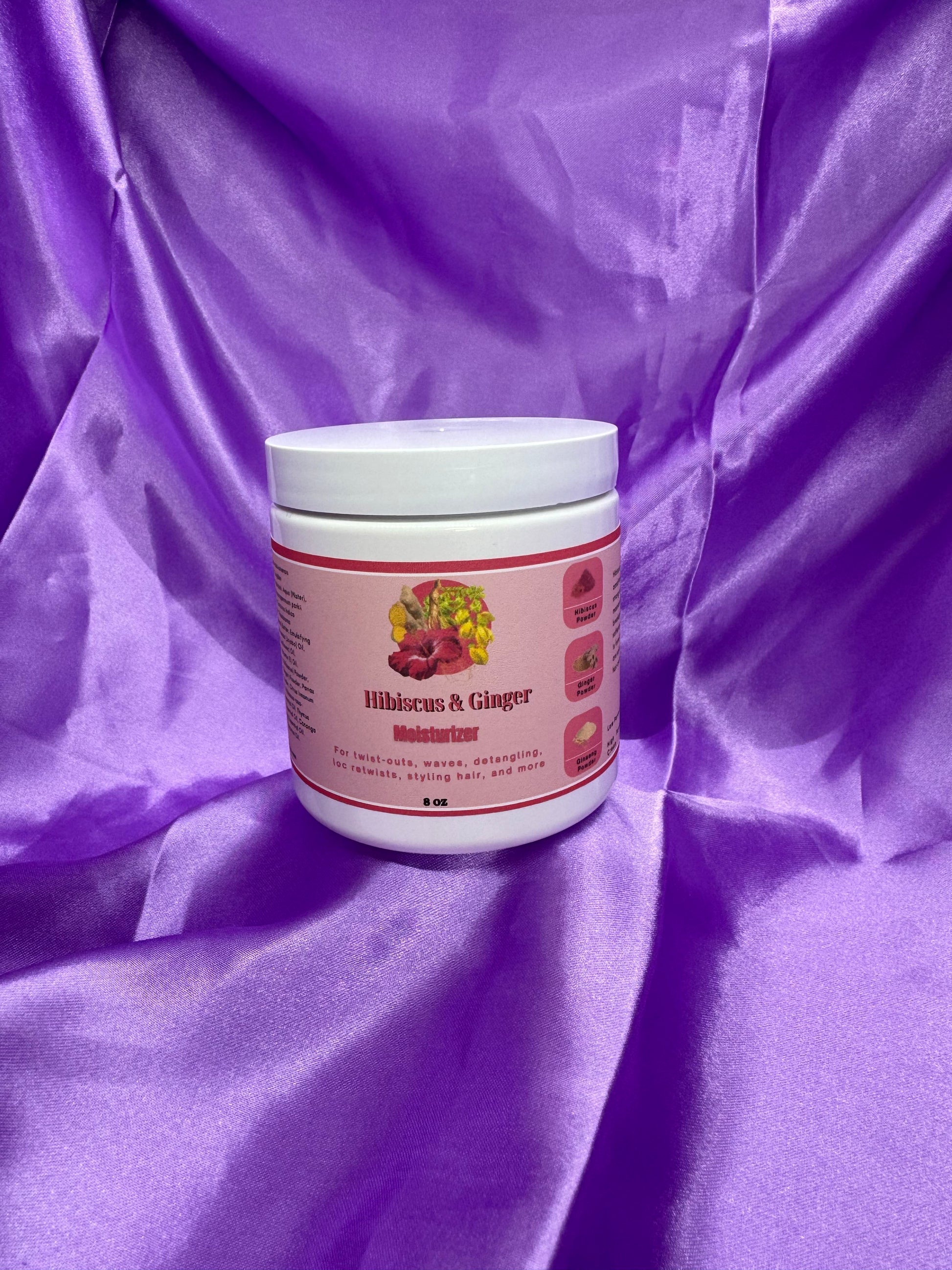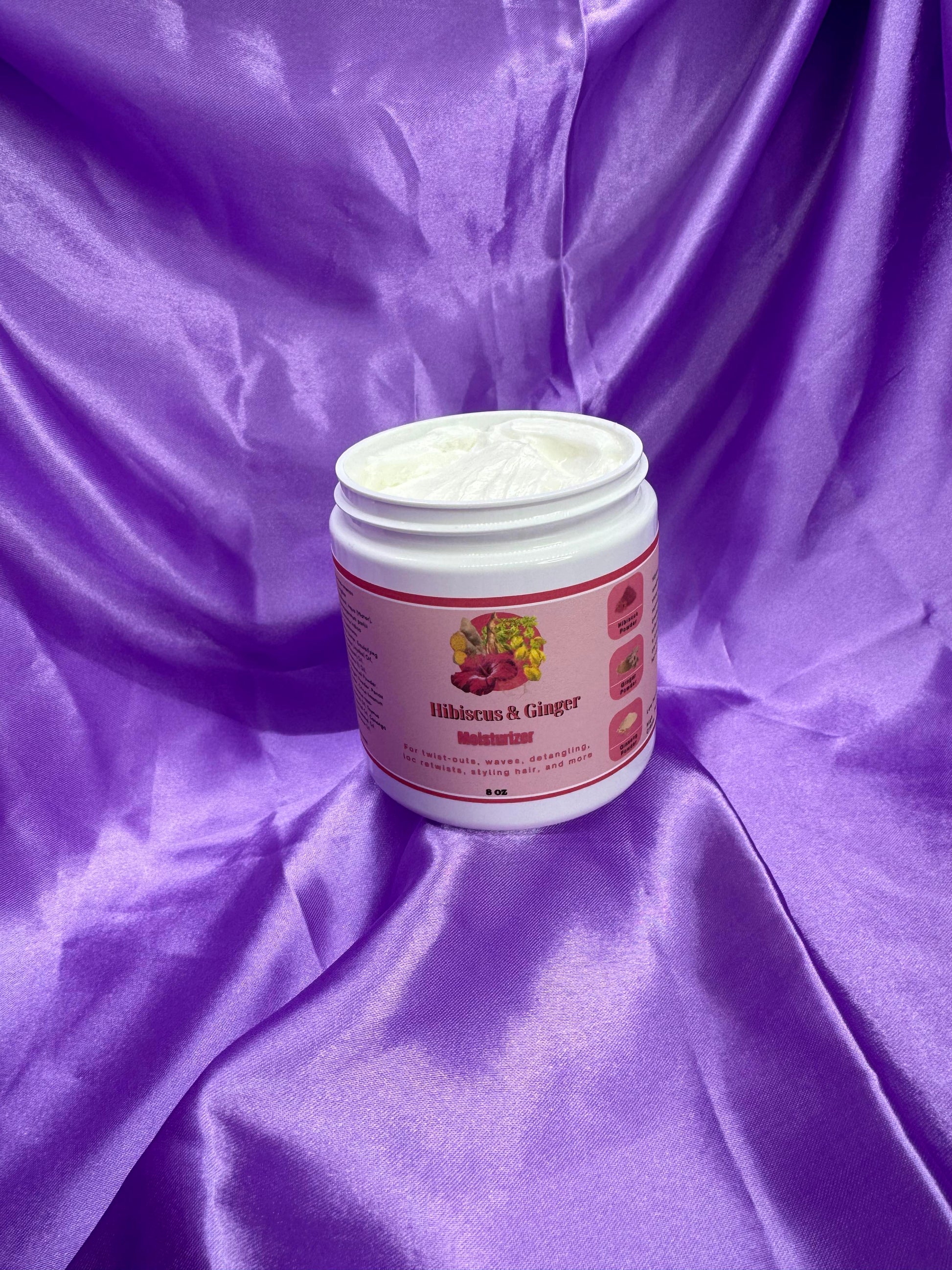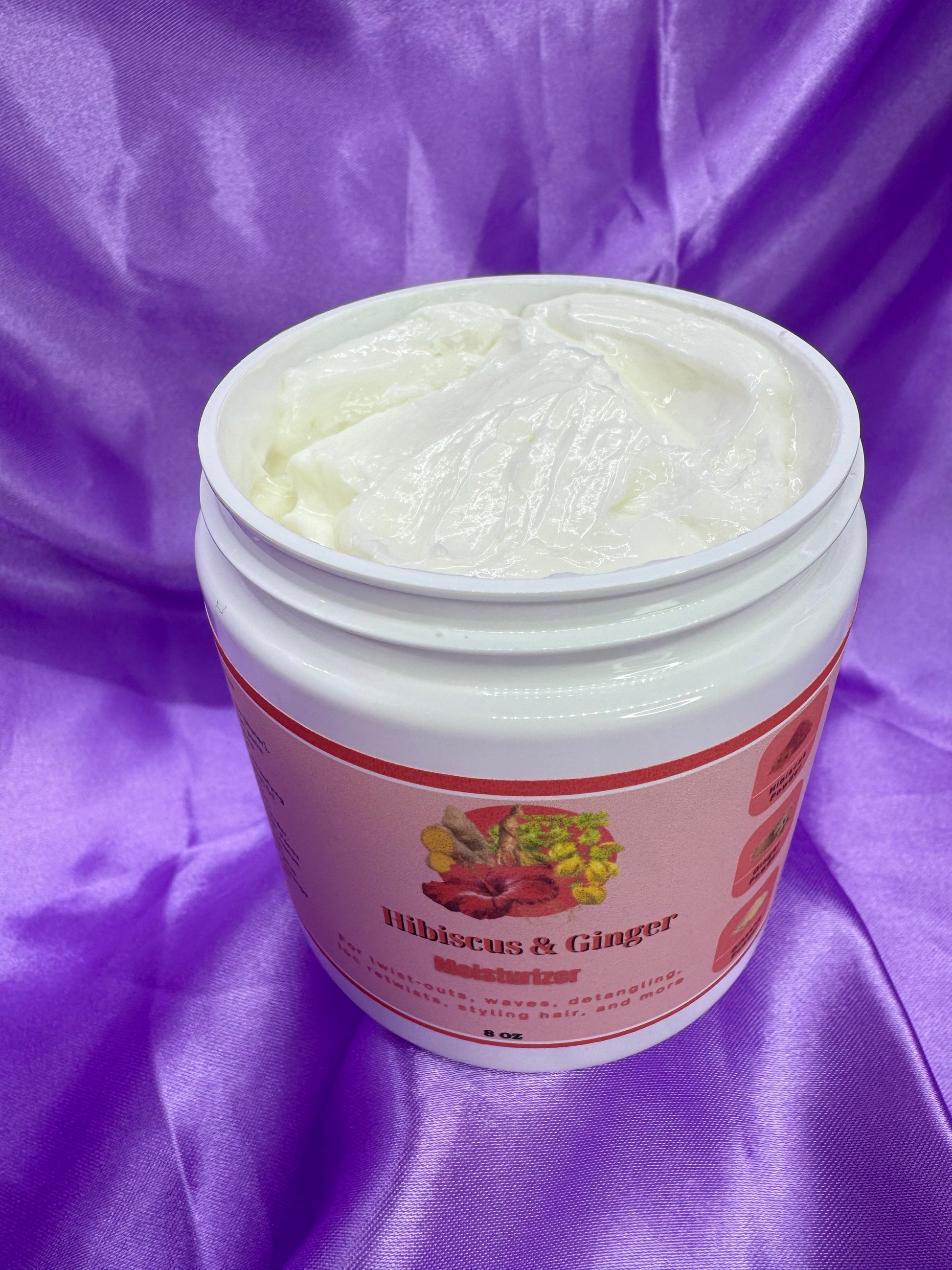 Hibiscus & Ginger Moisturizer provides conditioning benefits that will leave your coils strong and resilient. By locking in moisture, maintaining hair elasticity, preventing breakage, increasing hydration and shine, and softening hair strands. This lightweight cream is formulated with natural oils and butters that are safe to apply to the skin as well. Keeps your hair and skin moisturized.